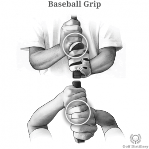 야구의 배트 쥐는 법과 같아서 베이스 볼 그립(Baseball grip)이라고 합니다. 또는 내추럴 그립(Natural grip)이나 텐 핑거 그립(Ten finger grip)이라고도 불립니다. 파워를 내기에 좋다고 알려져 있고 Gtour 골퍼인 K스타 한백님이 베이스볼 그립을 사용합니다.(체구에 비해 매우 장타자). 하지만 위의 다른 두 그립과 다르게 양손의 체결이 전혀 없어서 양손의 협응이 중요합니다. 그만큼 컨트롤이 어렵고 손목을 제어하는 것도 쉽지 않습니다. 일반적으로는 어린아이들이 처음 클럽을 휘두르기 시작할 때 채택하곤 합니다. 가장 쉬운 그립으로 골프 스윙의 다른 영역에 쉽게 집중할 수 있다는 장점이 있습니다. 그립의 모양은 이름과 마찬가지로 야구방망이를 잡는 모습과 같습니다.