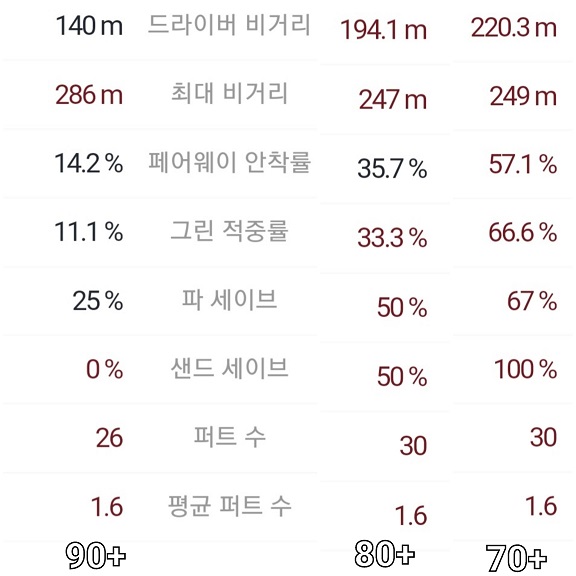 골프존과 같은 스크린골프 게임이 아닌 실제 라운드에서도 90타대 플레이어와 70타대 플레이어의 GIR 차이 역시 위 표와 비슷한 양상을 보입니다. 필드에서 70타대 플레이어는 보통 일부 프로이거나 고급 아마추어 골퍼로 간주되며, 이들은 대부분의 홀에서 그린 인 레귤레이션을 성공할 가능성이 높습니다. 70타대 플레이어는 대략 60% 이상의 GIR 비율을 가진다고 합니다. 반면, 90타대 플레이어는 보통 중급 골퍼로 간주되며, 그들의 GIR 비율은 훨씬 낮을 것입니다. 90타대 플레이어의 GIR 비율은 대략 30% 부근 이거나 그 이하일 가능성이 아주 높습니다. 만약 여러분의 그린 적중률이 아주 높은데도 불구하고 스코어가 나쁘다면 퍼팅라인을 읽는 법과 정화하게 퍼팅하는 연습을 더 열심히 하시는 게 좋겠습니다. 하지만 반대로 여러분의 그린적중률이 낮은데도 불구하고 스코어가 아주 좋다면 퍼팅 실력이 아주 좋은 편이니 샷의 정확도를 올리는 연습을 더 많이 할 것을 추천합니다.